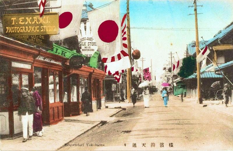 BELOW : Detail from the earliest known image of T. Enami's studio taken between 1892 and 1893. (Full albumen print is not shown). It was photographed by Enami's friendly competitor and neighbor Kozaburo Tamamura, whose studio was located at No.2 Benten Street. The pre-1894 date of the image is known by the missing landmark "Clock Tower Building". It would be built in 1894 just down the street on the right hand side, and appear in endless views and postcards as the most recognizable landmark of Benten Street.
