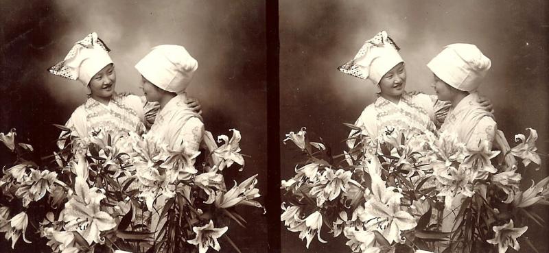 A Variant of Enami's "S 26 Girls Looking at Pictures". Enami took several variants of each title as back up. Occasionally they were published. This particular image is scanned from an un-transposed contact proof print. You can free-view it in 3-D using the "cross-eyed method. The mounted and colored stereoviews seen throughout this site can be free-viewed using the "parallel method". Good luck !