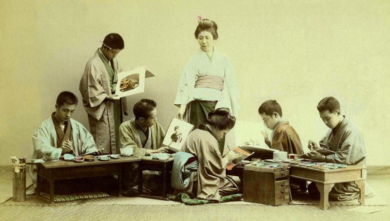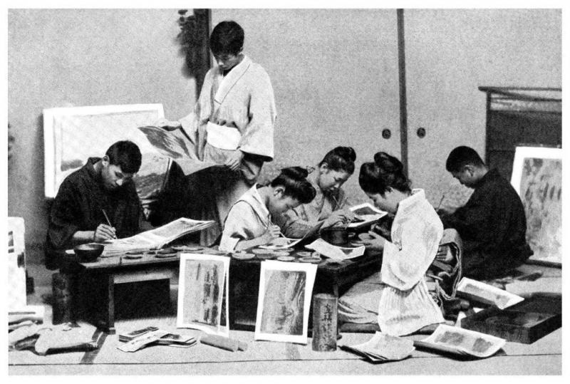 Notice the array of flat saucers to hold the various water-color /aniline dyes. It is said that each person was responsible for a certain range of colors, passing the picture "down the line" until complete -- no one person completing a photograph alone.