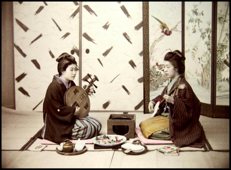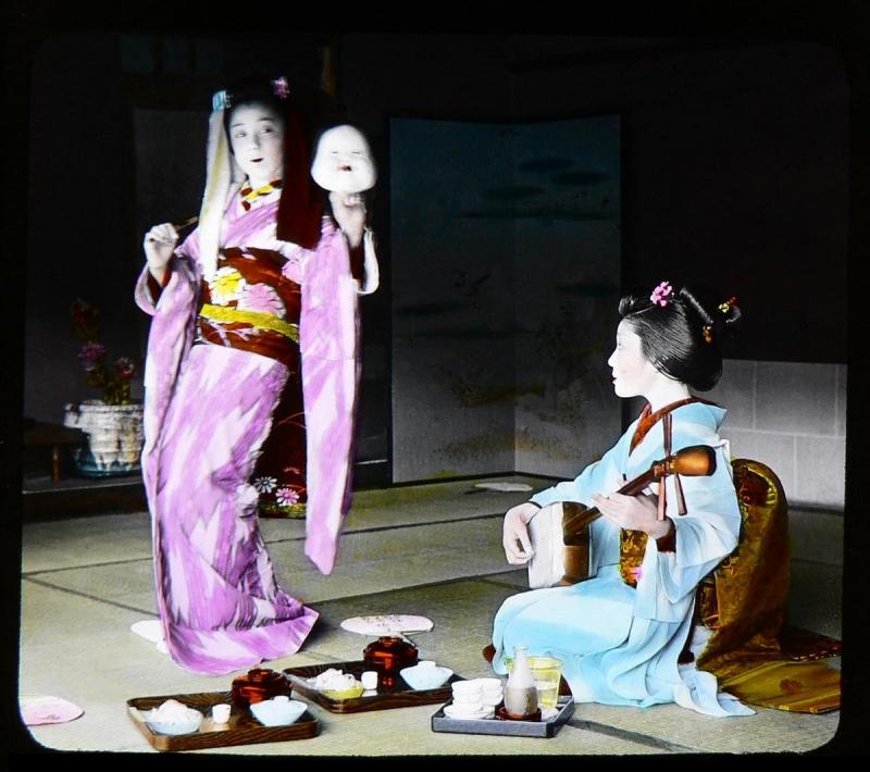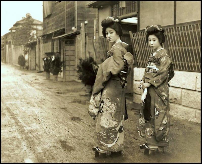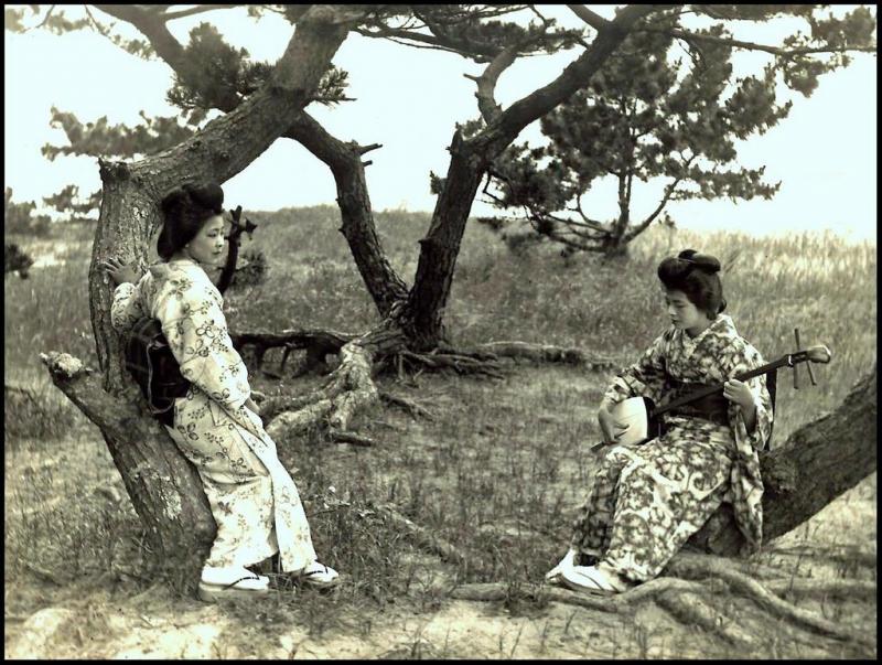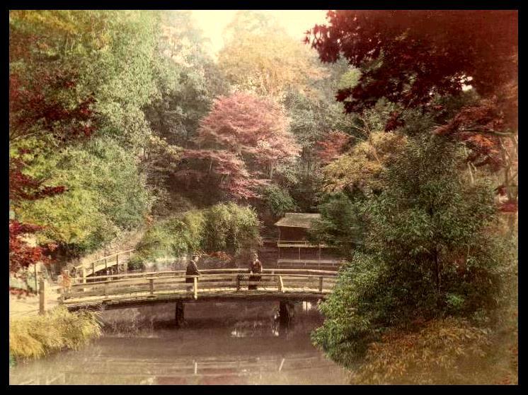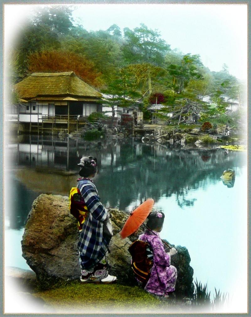 Two Geisha in the Genkyu Gardens of Hikone. Ca.1898-1910