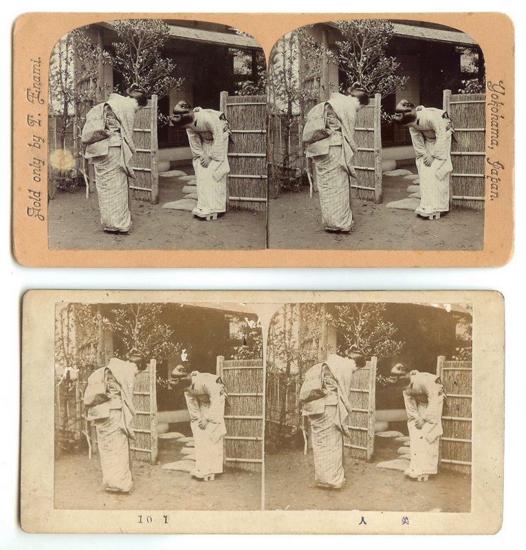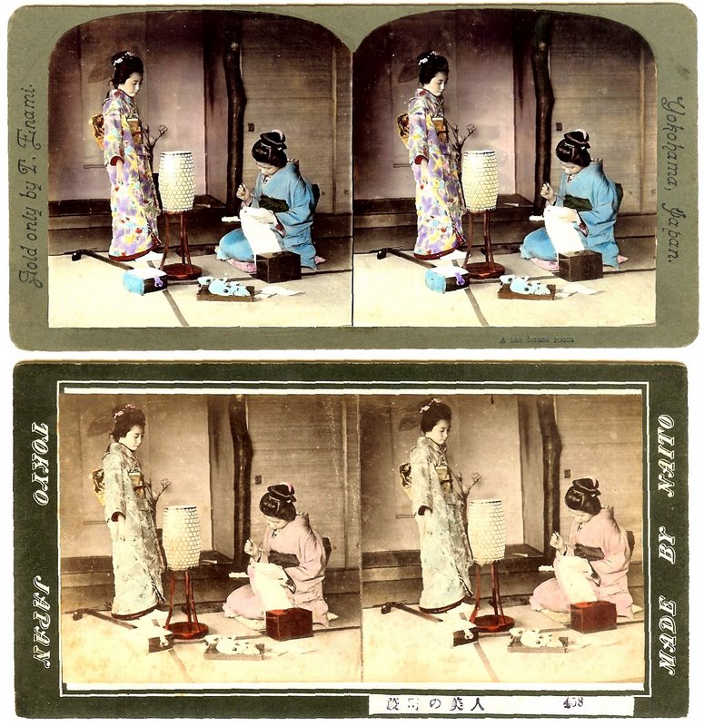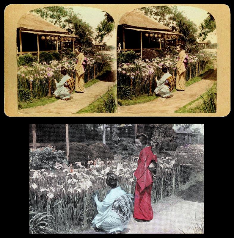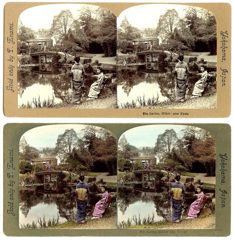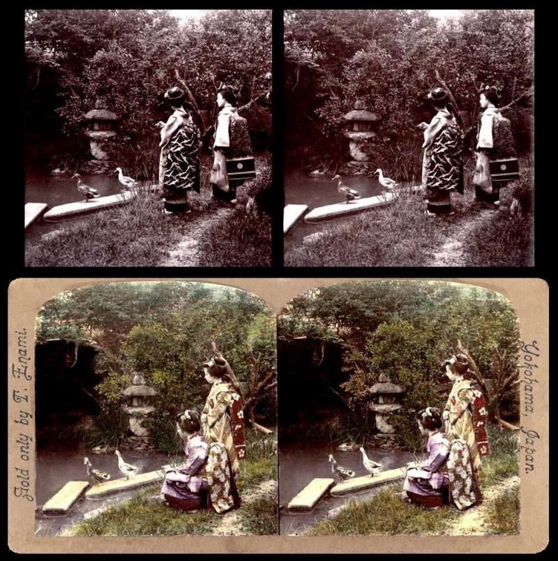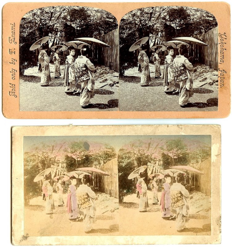 The colorists were true artists, and could transform any b/w print, slide, or stereoview into a delicate work of great beauty, as evidenced by the two version above. The total cost for 100 of these highly detailed, hand-tinted stereoviews 110 years ago ? 28 YEN !