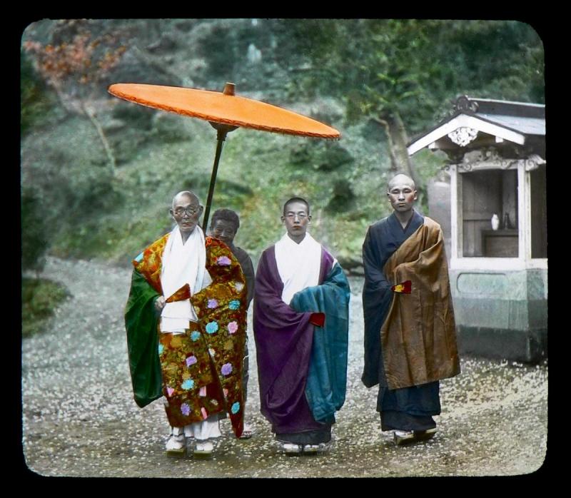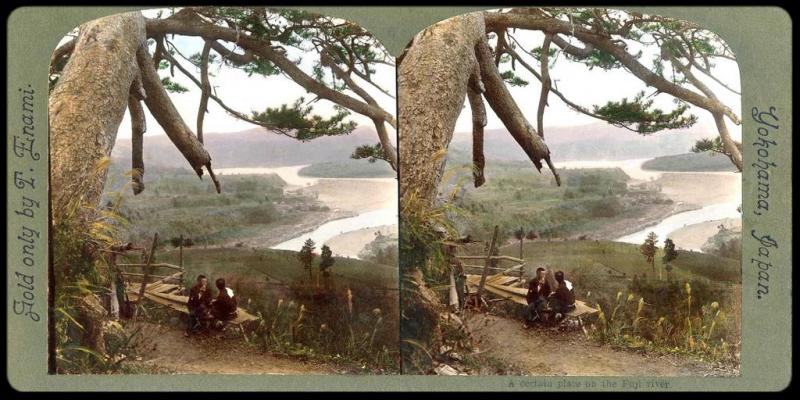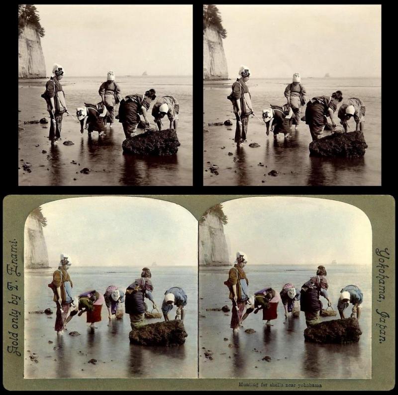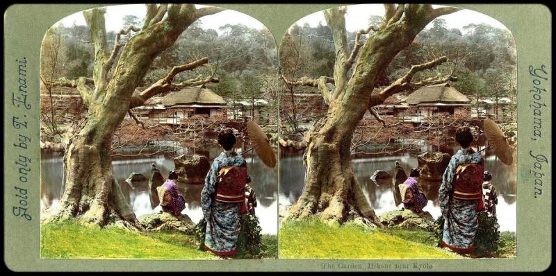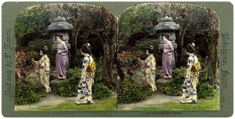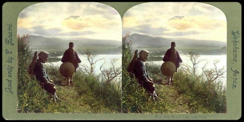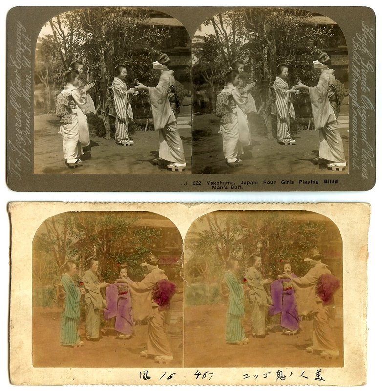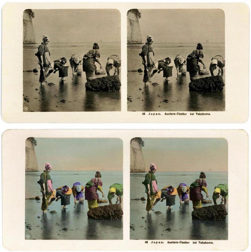 The colorists were true artists, and could transform any b/w print, slide, or stereoview into a delicate work of great beauty, as evidenced by the two version above. The total cost for 100 of these highly detailed, hand-tinted stereoviews 110 years ago ? 28 YEN !