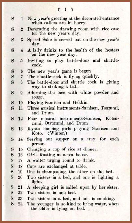 30 pages of detailed titles --- many of them longer than the abbreviated versions found on the prints themselves --- help to separate the work of Enami from other photographers who used similar number schemes and lettering for the in-photos captions found on many large albumen prints from the mid and late-Meiji eras.