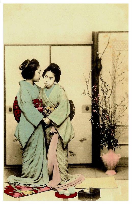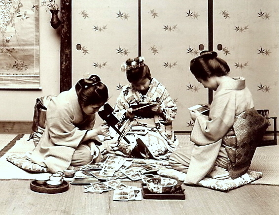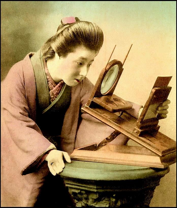 Two Geisha and a Maiko Looking at Stereoviews in T. Enami's Studio.Ca.1898-1907. A nice 3-D version of the above is shown on the Home Page. Scroll way down to see it.