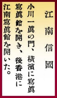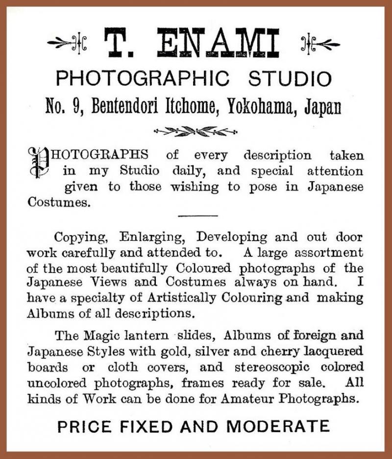 In 1904, The Guidebook for Travelers in Japan published by theNYK Japan Mail Steamship Line (Nippon Yusen Kaisha) recommended "Mr. Enami" as one of only seven named studios for tourists and collectors to obtain good, hand-colored photographs.