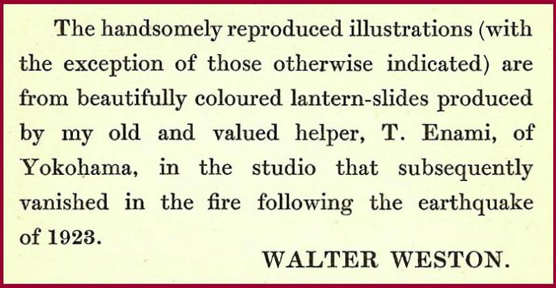 At least 35 images (including eight full-color plates) were taken directly from T. Enami images. Unfortunately, in an inexplicable turn of events, all were wrongly credited to the Rev. Walter Weston, who had penned the Japan text for Hammerton.