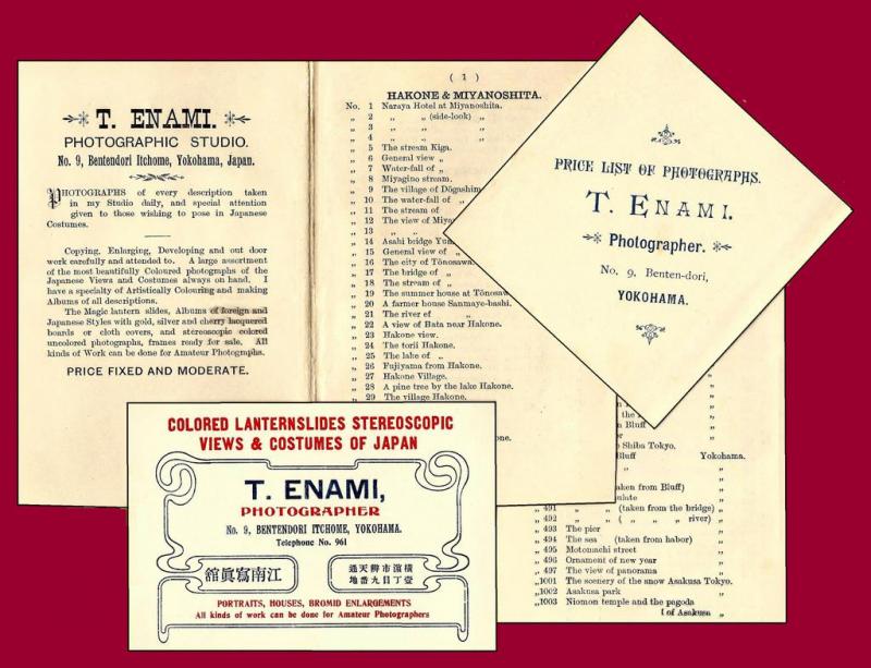 Curiously, and in spite of the longevity of many famous commercial Japanese photo studios, T. Enami and Kimbei Kusakabe are now the only two Japanese photographers known to have a surviving list of their commercial 2-D images.